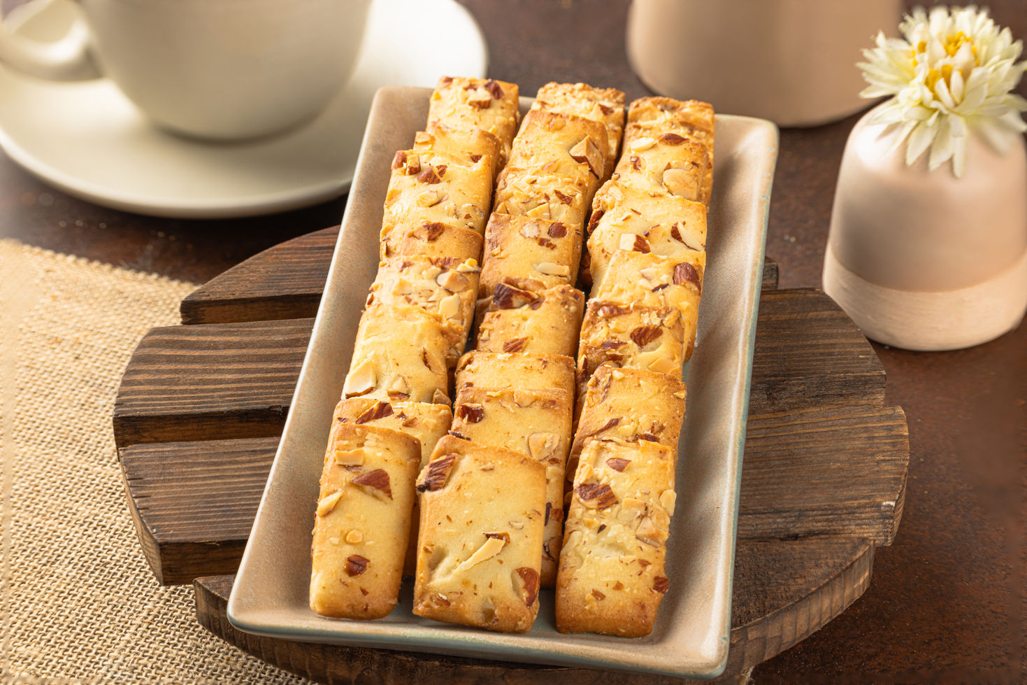 Twice-baked almond biscotti, ultra-crisp and aromatic; perfect coffee dunker and elegant gifting jar snack today.