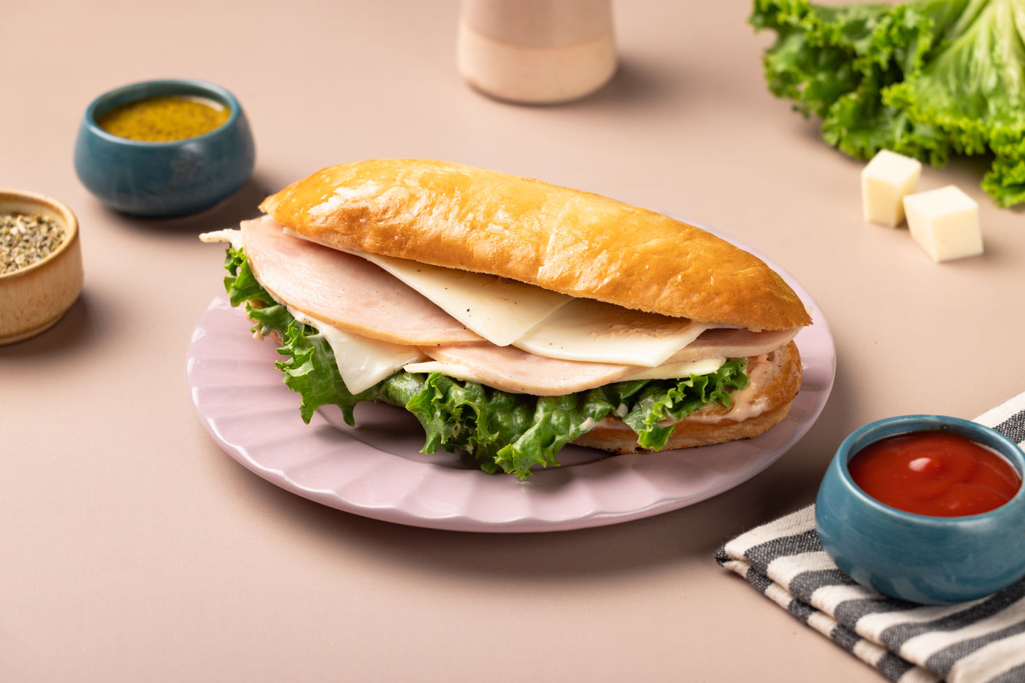 Golden grilled panini cradling ham molten cheese lettuce tandoori mayo cracked pepper; savoury celebratory classic.